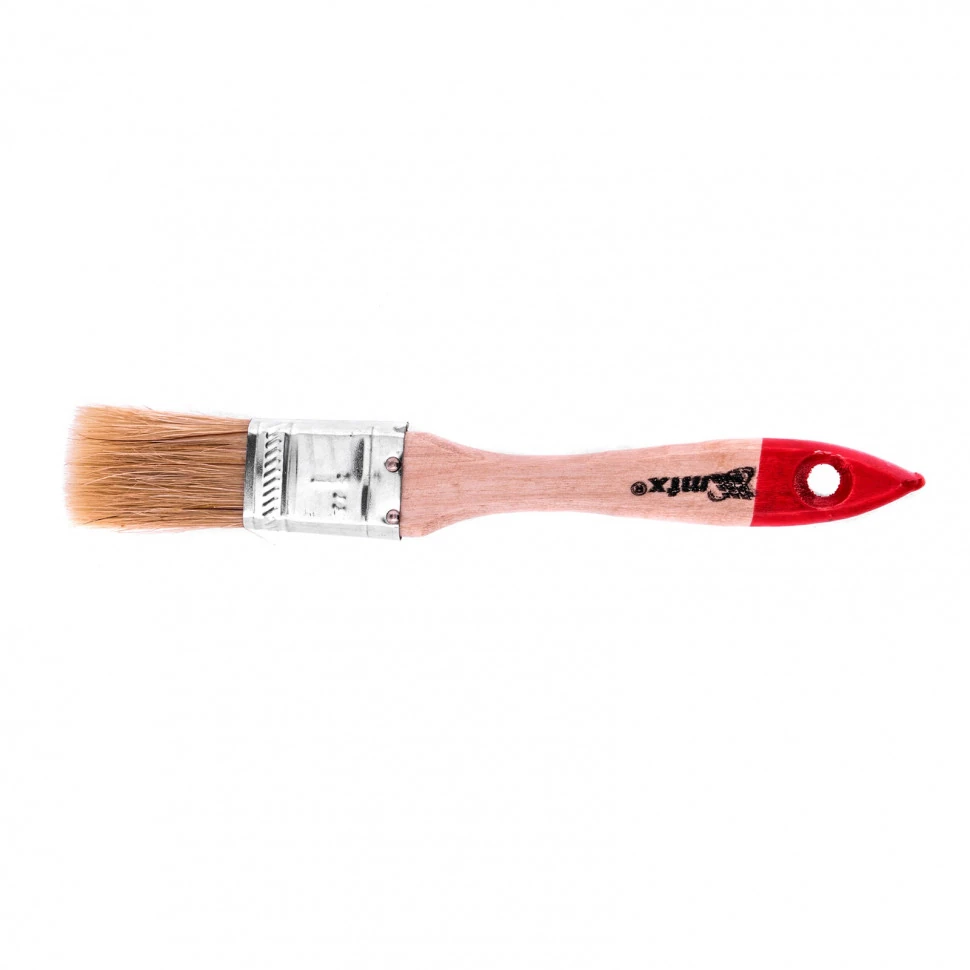 Плоская кисть MTX «Стандарт» 82520 шириной 1 дюйм (25 мм), с натуральной щетиной и деревянной ручкой, — недорогой инструмент для проведения бытовых малярных работ. Натуральная светлая щетина обладает высокой износоустойчивостью и подходит для нанесения красок на основе растворителей. А благодаря небольшой ширине 25 мм кистью удобно окрашивать узкие поверхности, например, плинтуса и рамы.ПреимуществаЩетина надежно закреплена и не выпадает при интенсивном использовании благодаря фиксации на металлический бандаж.Бандаж не ржавеет от воздействия воды и ЛКМ, т.к. обработан антикоррозийным покрытием.Расщепленная на концах щетина обеспечивает равномерное нанесение краски за счет высокой впитывающей и отдающей способности.Деревянная рукоятка отшлифована, покрыта защитным лаком и имеет утолщение в зоне захвата, поэтому удобна в использовании и не боится рассыхания.Кисть с отверстием на рукоятке можно вешать на крючок или гвоздь для практичного хранения.