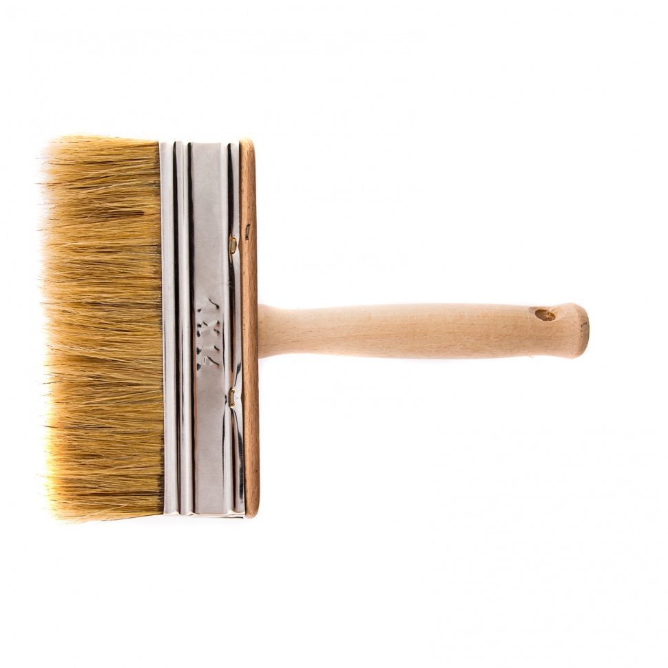 Кисть-ракля 84078, 40 х 140 мм, с натуральной щетиной, деревянными корпусом и ручкой, служит для нанесения лакокрасочных материалов на поверхности большой площади. Может использоваться для обработки фасадов, стен и потолков. Натуральная щетина с добавлением искусственного ворса не деформируется при работе с водно-дисперсионными красками и устойчива к растворителям. Поэтому кисть может применяться с ЛКМ на водной основе, масляными красками, лаками, а также клеящими составами.ПреимуществаНатуральная светлая щетина двойной выварки обладает хорошей краскоотдачей и износоустойчивостью, обеспечивая равномерное распределение краски по поверхности.Свиная щетина обладает высокой износостойкостью, что продлевает срок службы кисти.Щетина с расщепленными кончиками способна удерживать и отдавать большой объем краски, равномерно распределяя ее по поверхности — это повышает качество работы, экономит расход ЛКМ и время мастера.Металлический бандаж защищен от ржавчины антикоррозийным покрытием, поэтому кисть выдерживает замач