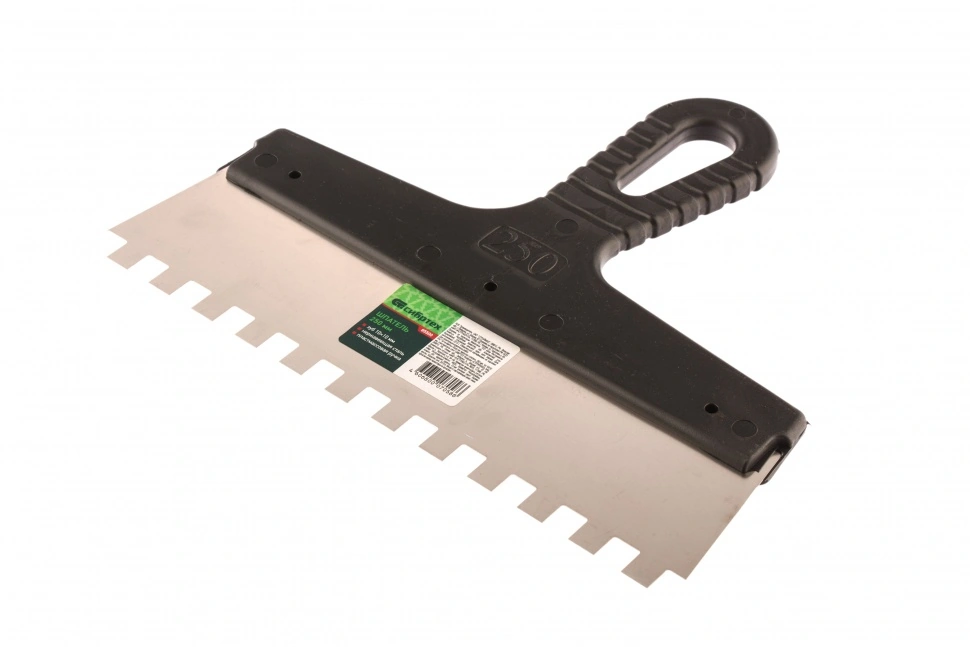 Шпатель из нержавеющей стали, 250 мм, зуб 10 х 10 мм, пластмассовая ручка Сибртех [1 шт]