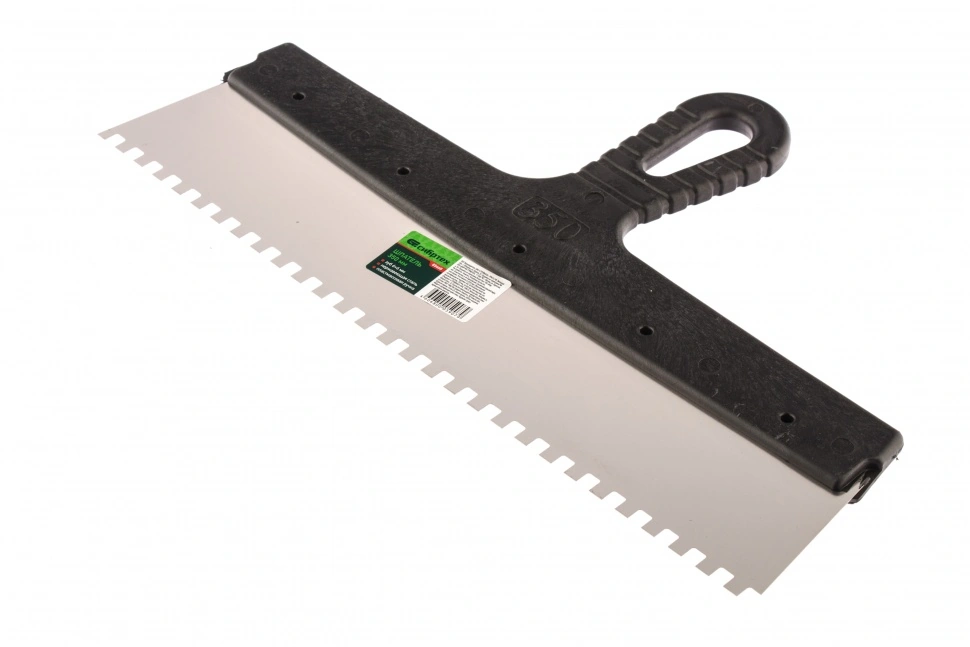 Шпатель Сибртех 85468 шириной 350 мм, из нержавеющей стали, с пластмассовой ручкой и зубьями 6 х 6 мм, применяется для равномерного нанесения клея при укладке мелкоформатной плитки, мозаики и т.д. Квадратные зубья облегчают нанесение клеевого состава, позволяя ровно и экономно распределять его по поверхности. Зубья размером 6 х 6 мм рассчитаны на плитку площадью 100-400 см2.