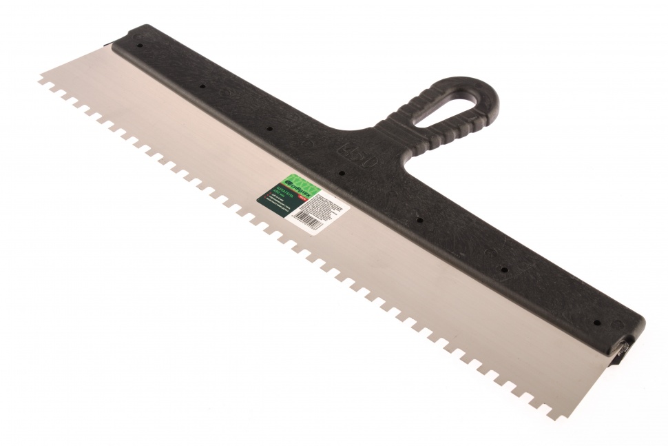Шпатель Сибртех 85470 шириной 450 мм, из нержавеющей стали, с пластмассовой ручкой и зубьями 6 х 6 мм, применяется для равномерного нанесения клея при укладке мелкоформатной плитки, мозаики и т.д. Квадратные зубья облегчают нанесение клеевого состава, позволяя ровно и экономно распределять его по поверхности. Зубья размером 6 х 6 мм рассчитаны на плитку площадью 100-400 см2.