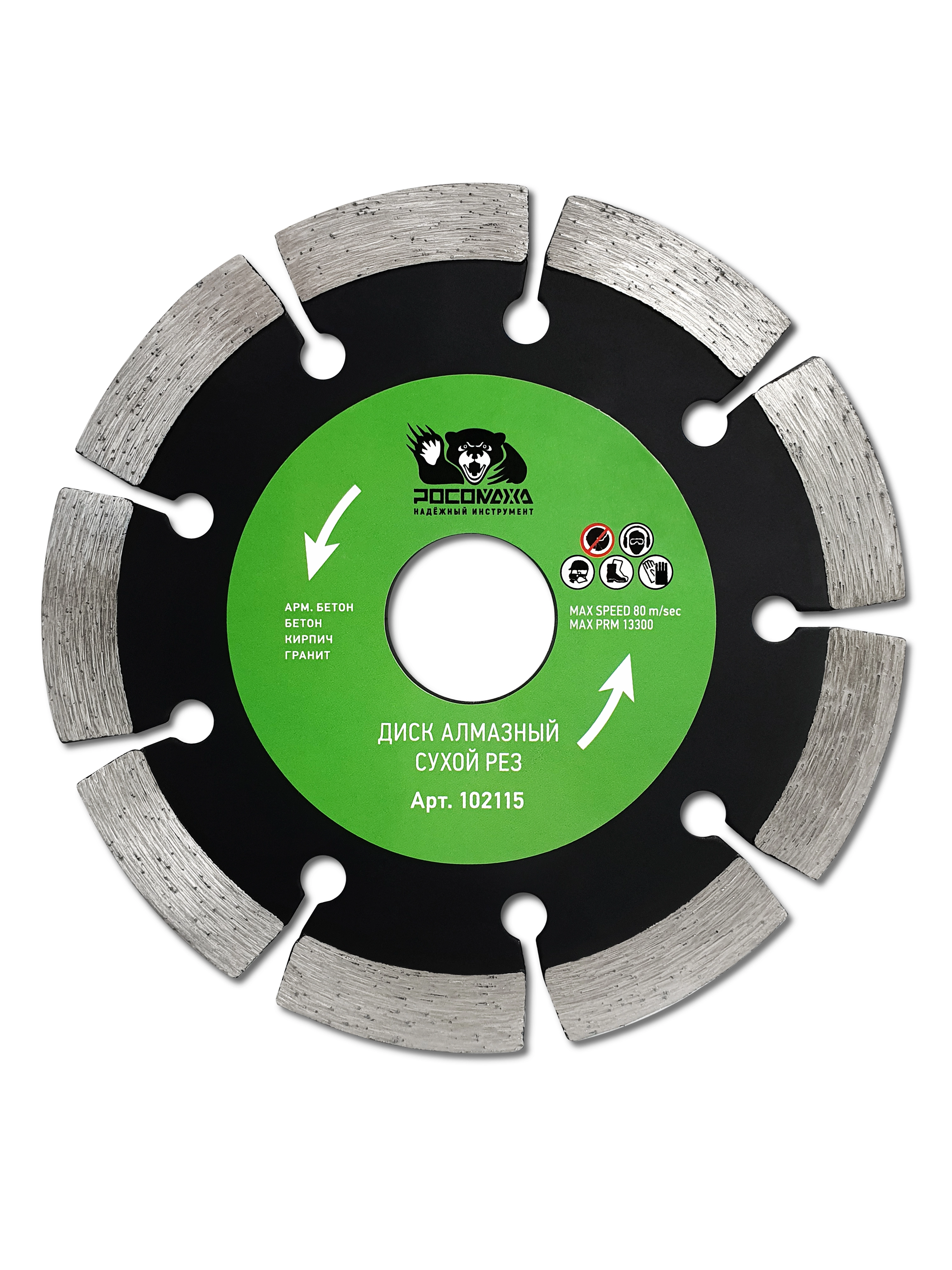 Сегментный диск "РОСОМАХА" СЕРИИ 102 предназначен для сухого реза бетона, армированного бетона и камня. Благодаря сегментной структуре и увеличенной рабочей части диск легко удаляет шлам + хорошо охлаждается, благодаря чему достигается максимальный ресурс при работе.