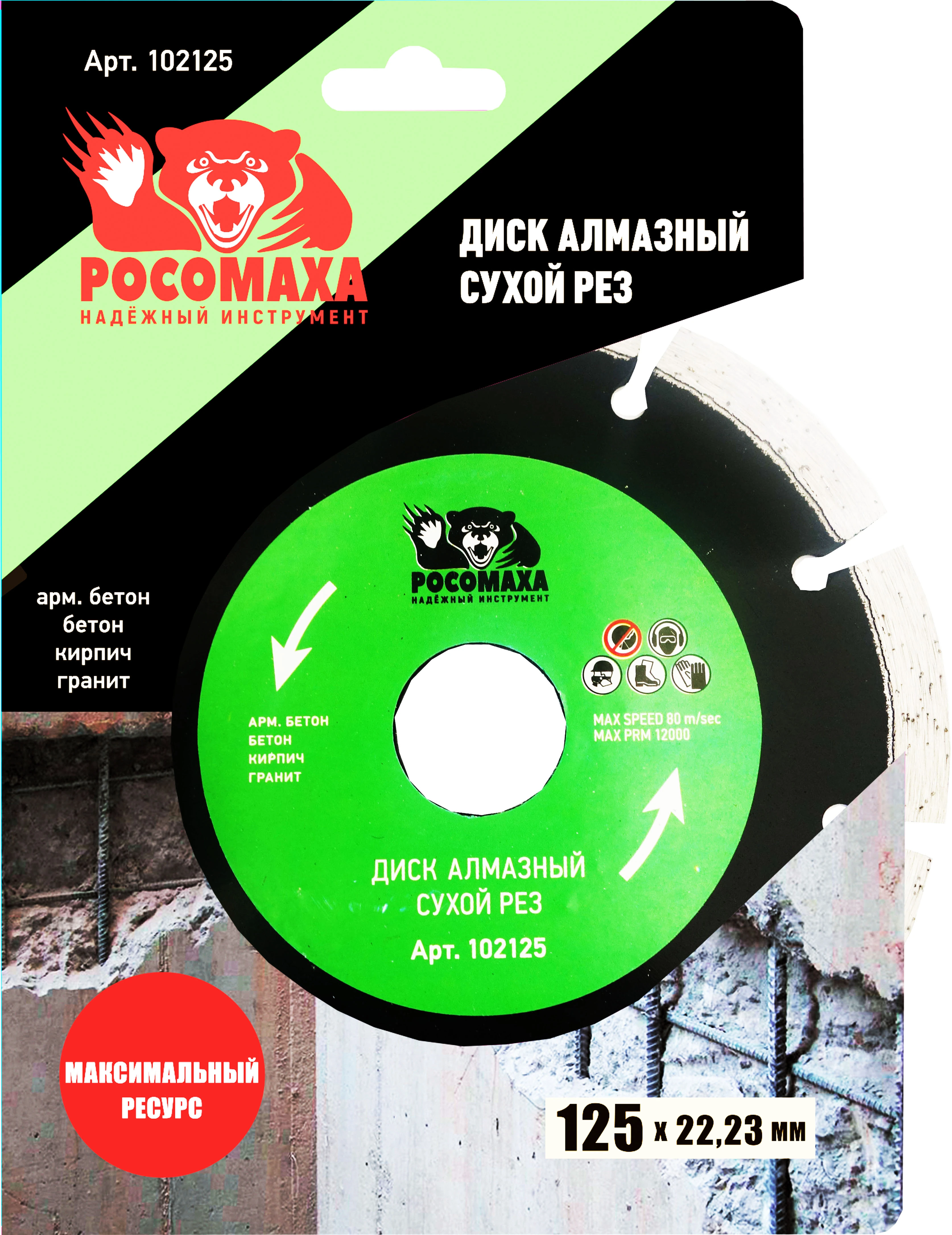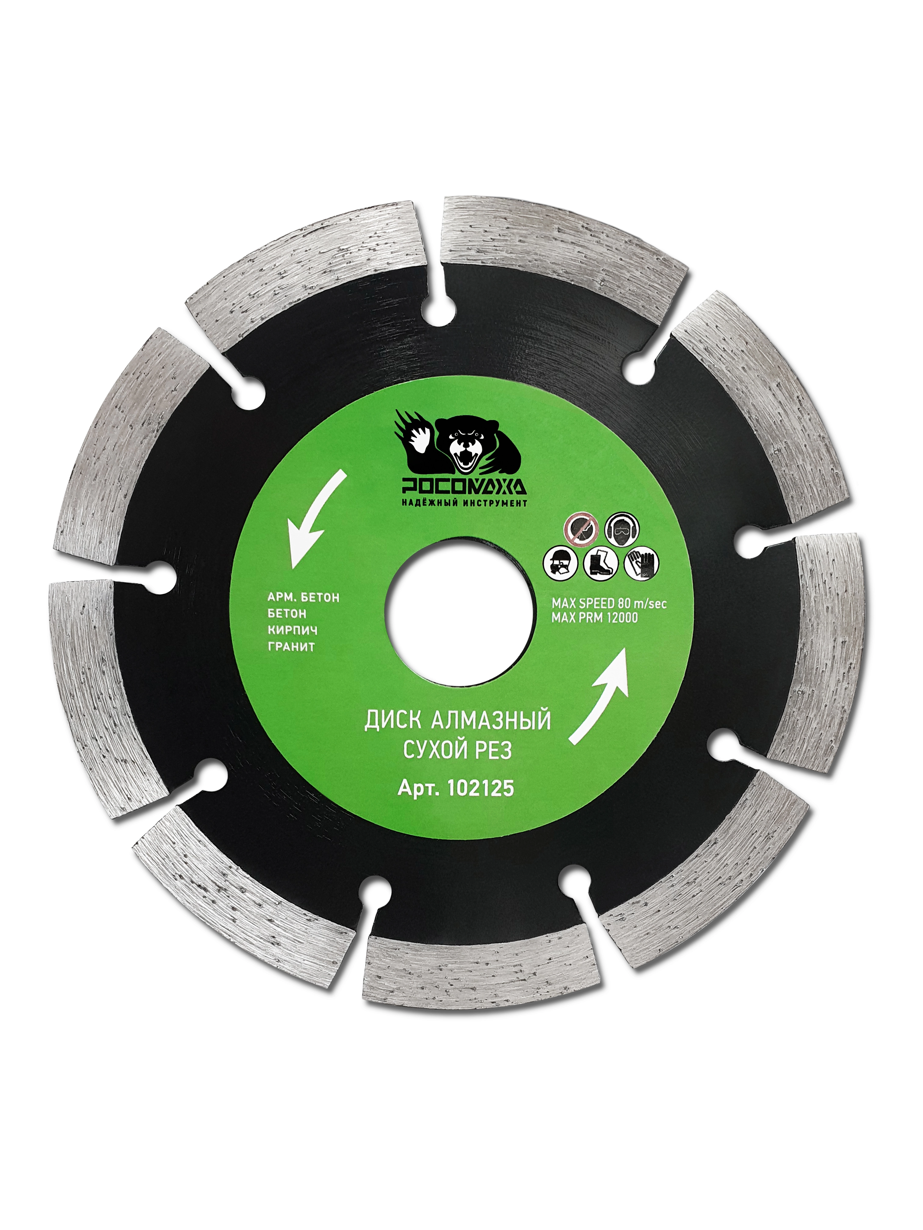Сегментный диск "РОСОМАХА" СЕРИИ 102 предназначен для сухого реза бетона, армированного бетона и камня. Благодаря сегментной структуре и увеличенной рабочей части диск легко удаляет шлам + хорошо охлаждается, благодаря чему достигается максимальный ресурс при работе.