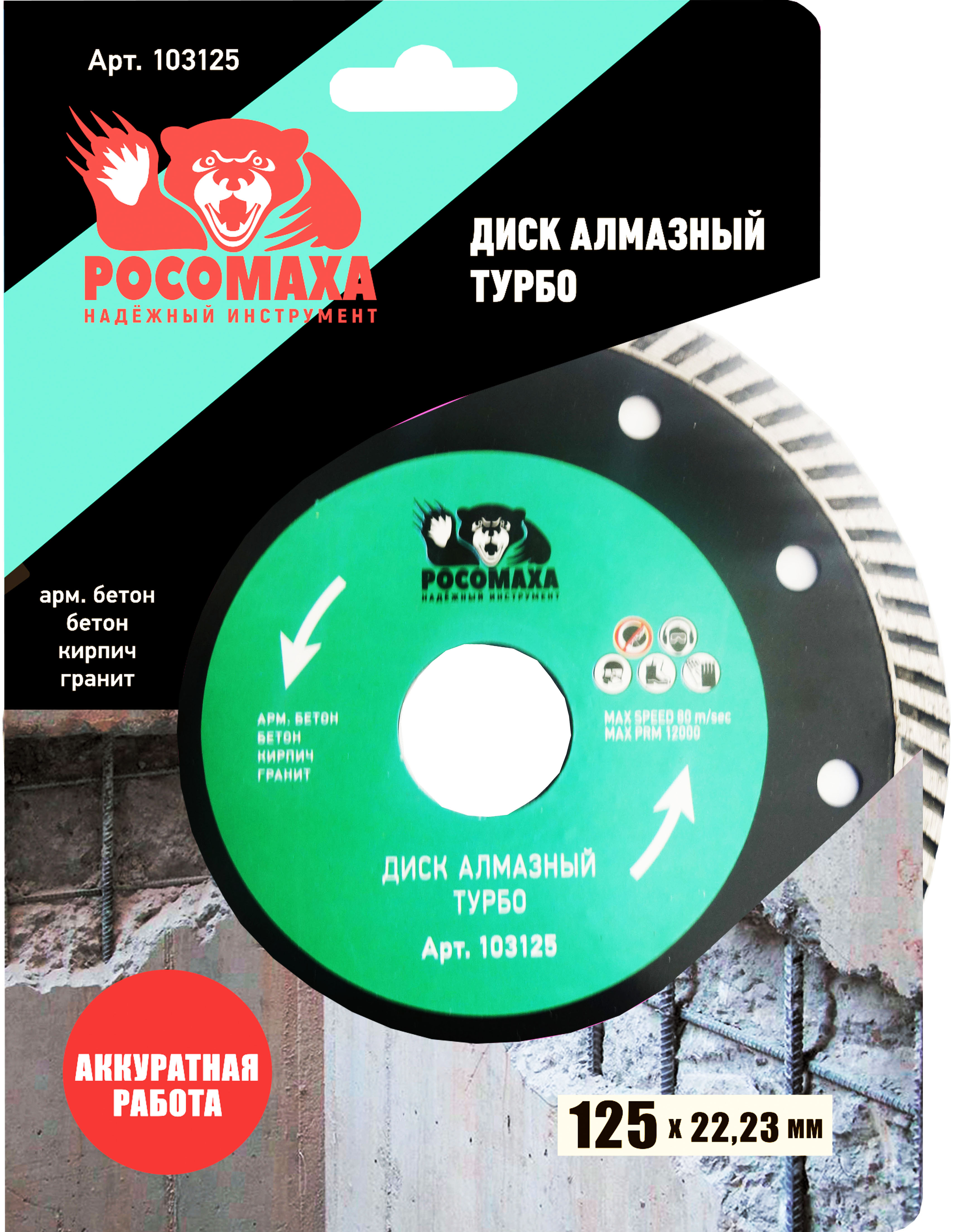 Турбированный диск "РОСОМАХА" СЕРИИ 103 предназначен для реза бетона, армированного бетона и камня. Благодаря специальной структуре и увеличенной рабочей части диск легко удаляет шлам + хорошо охлаждается, благодаря чему достигается аккуратный рез при работе.