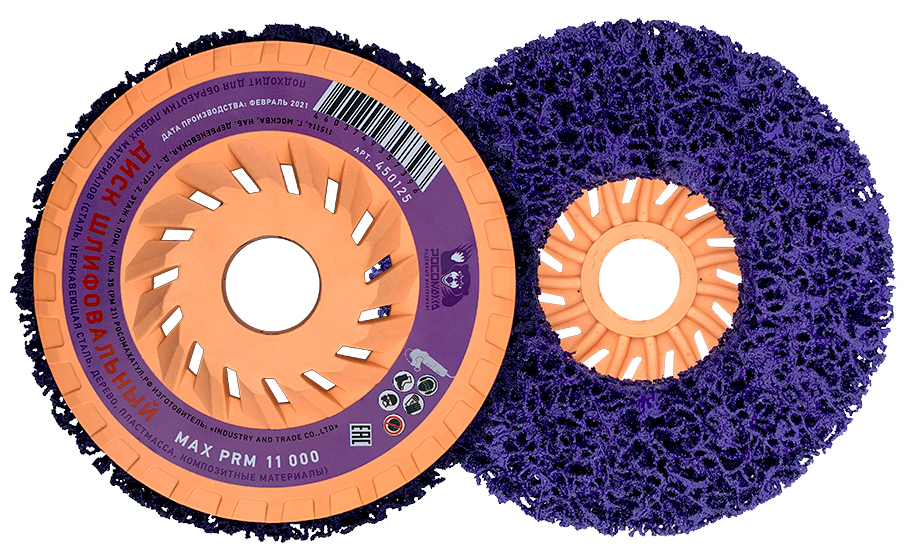 Зачистной круг "РОСОМАХА" представляет собой чистящее волокно, имеющее очень грубую структуру и состоящее из синтетического волокна и абразива. Открытая волоконная структура диска обеспечивает быстрое шлифование с очень незначительным засаливанием. Безопаснее чем проволочные щётки. Вид обработки: Удаление ржавчины, загрязнений с поверхности, коррозии, старой краски, клея, эпоксидных покрытий. Подготовка поверхности перед сваркой, очистка и доводка после сварки. Рекомендации по применению: – Наибольшую производительность можно достигнуть при рекомендованной скорости 15-20 м/с; – Не превышать максимальную угловую скорость; – Уже при незначительном прижимном усилии очень высокая эффективность шлифования.