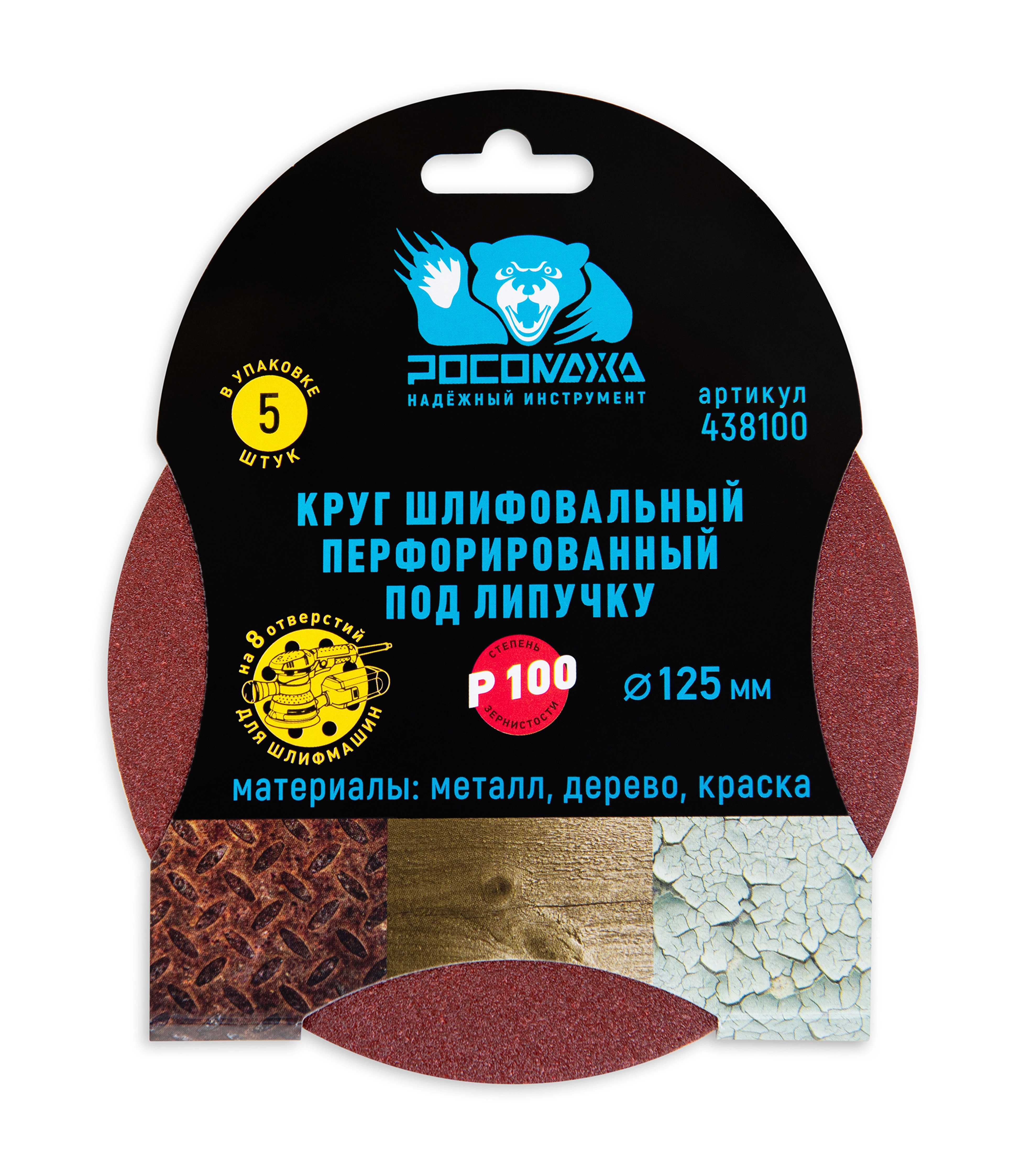 Круг шлифовальный, перфорированный 8 отверстий под липучку 125 мм зерно 100 "РОСОМАХА" [5 шт]