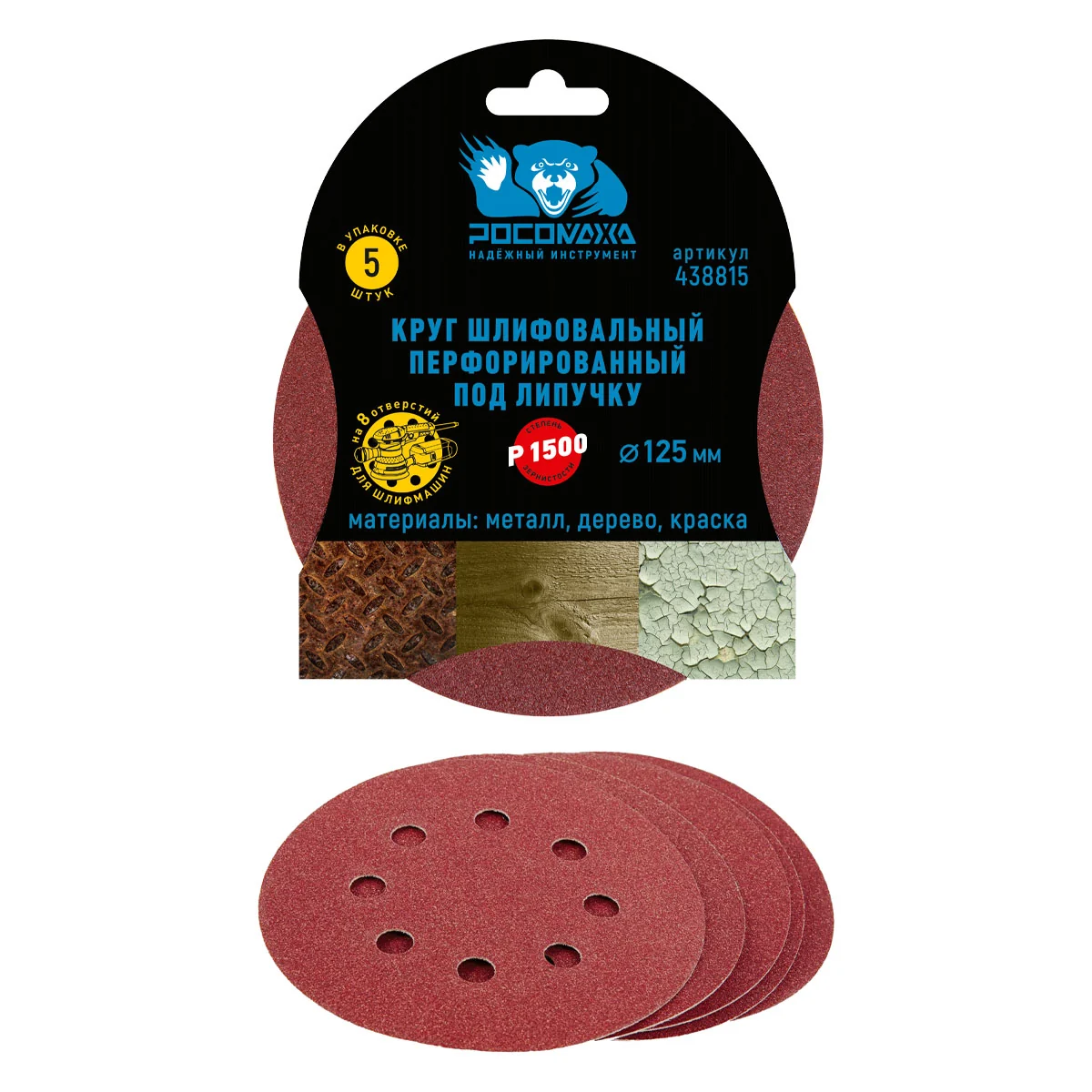 Круг шлифовальный, перфорированный 8 отверстий под липучку 125 мм зерно 1500 "РОСОМАХА" [5 шт]