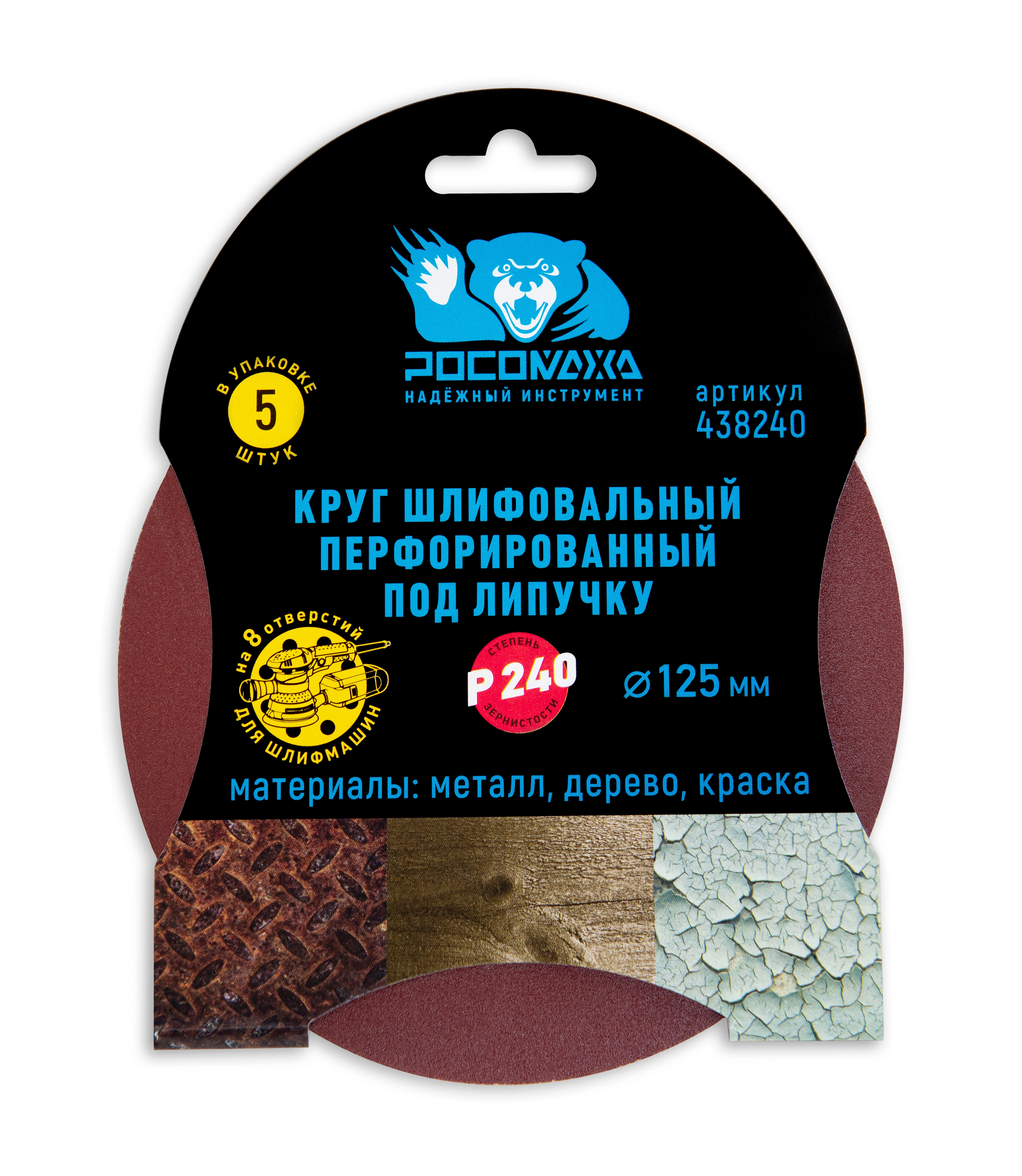 Круг шлифовальный, перфорированный 8 отверстий под липучку 125 мм зерно 240 "РОСОМАХА" [5 шт]