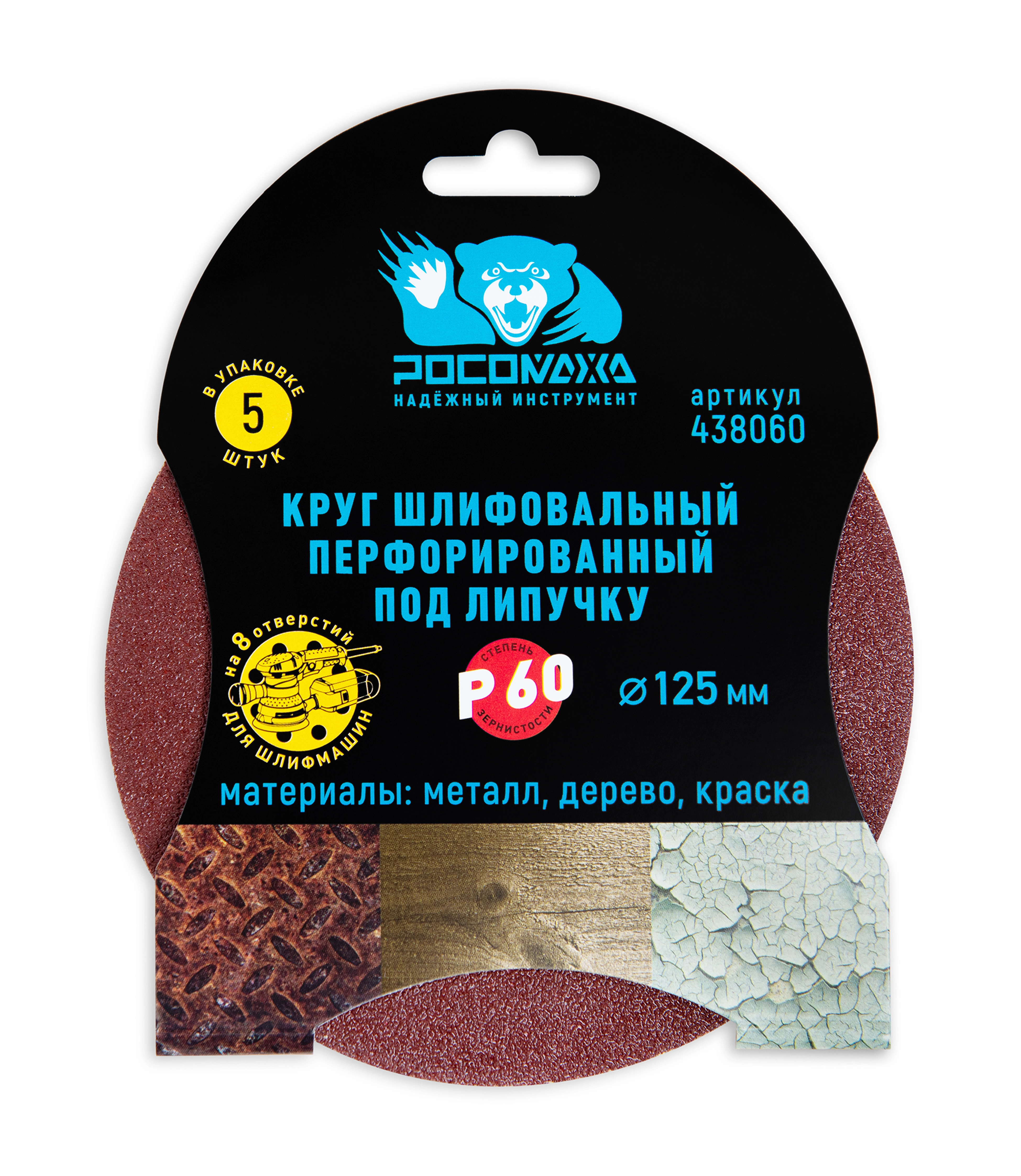 Круг шлифовальный, перфорированный 8 отверстий под липучку 125 мм зерно 60 "РОСОМАХА" [5 шт]
