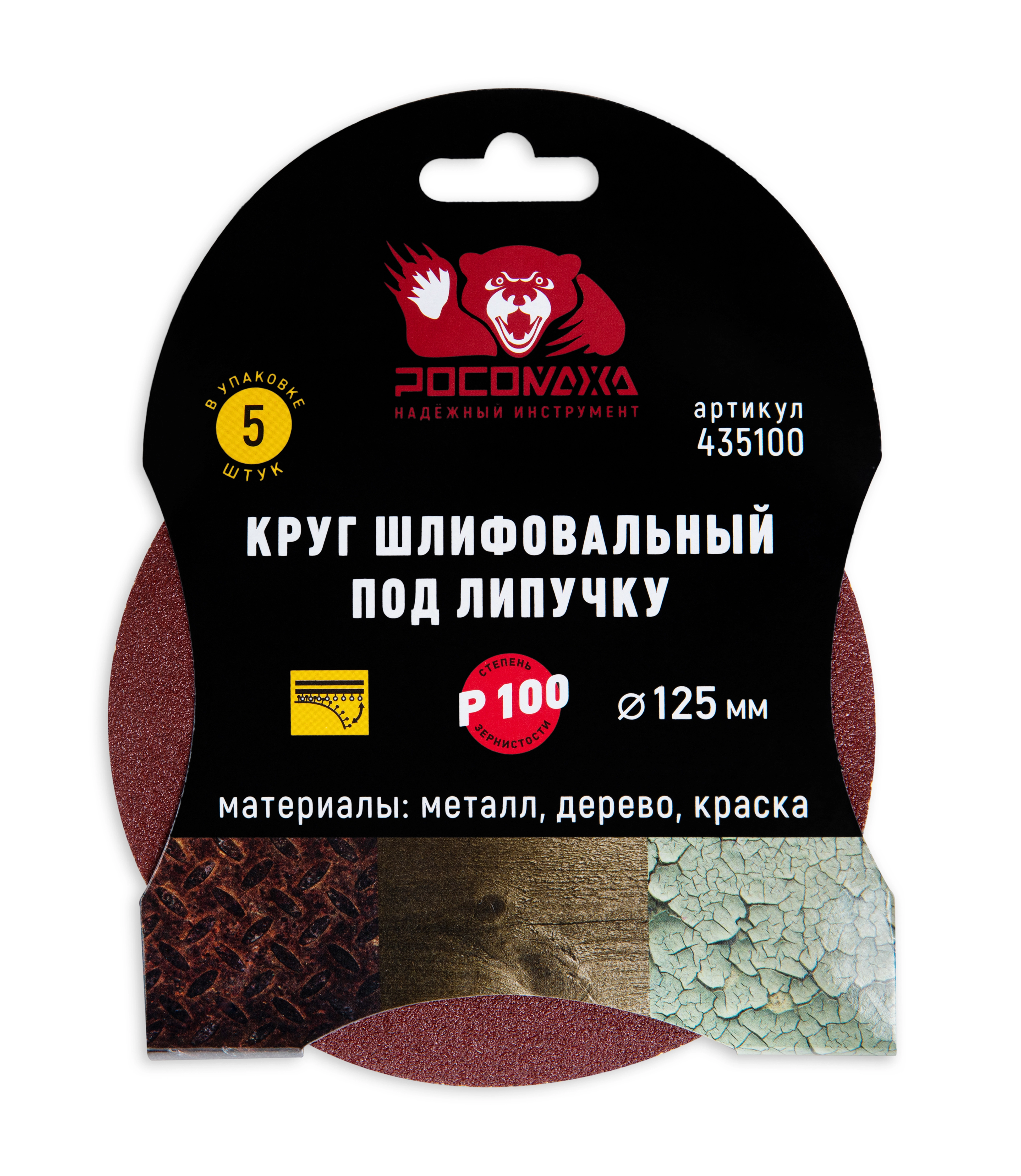 Круг шлифовальный под липучку 125 мм зерно 100 "РОСОМАХА" [5 шт]