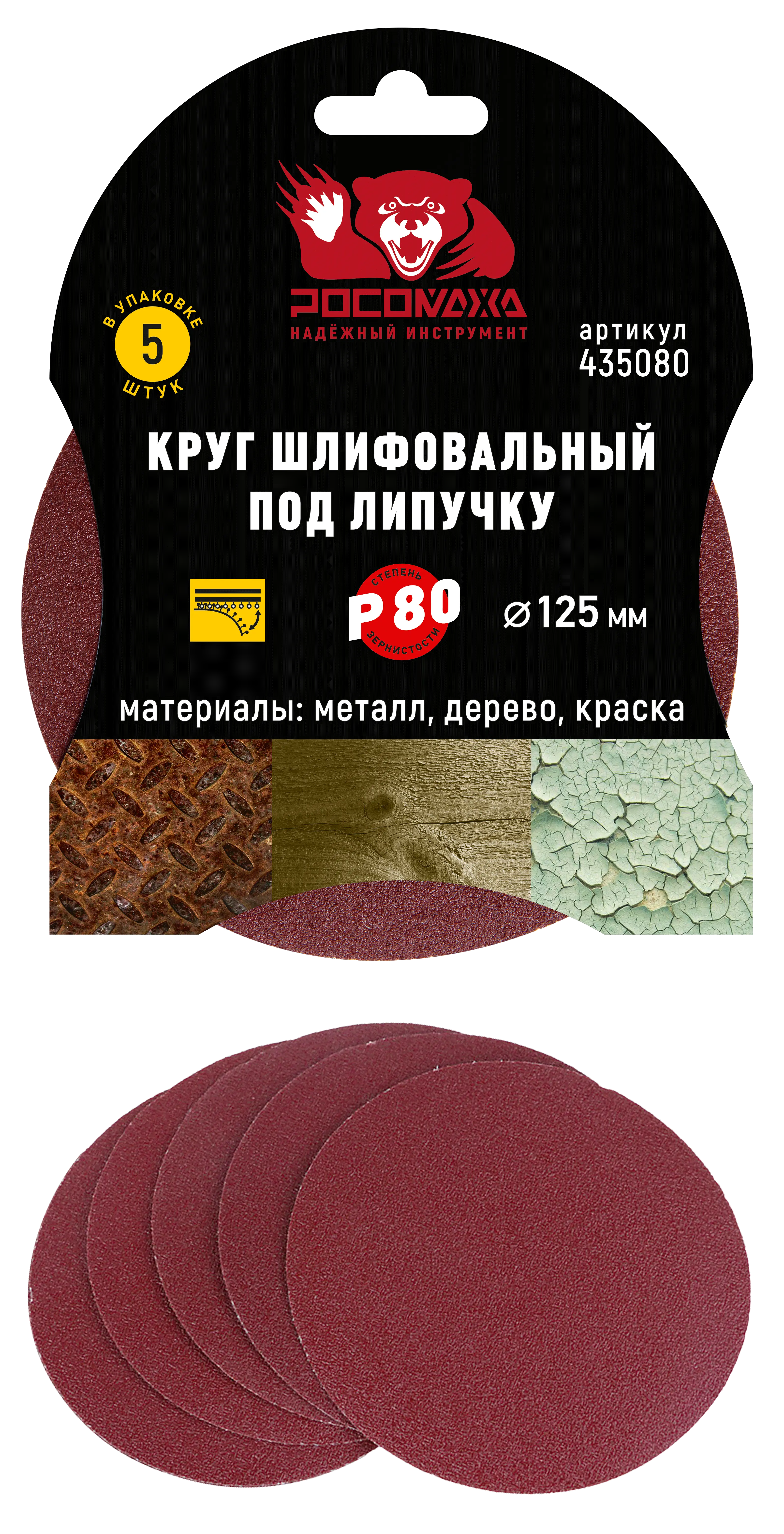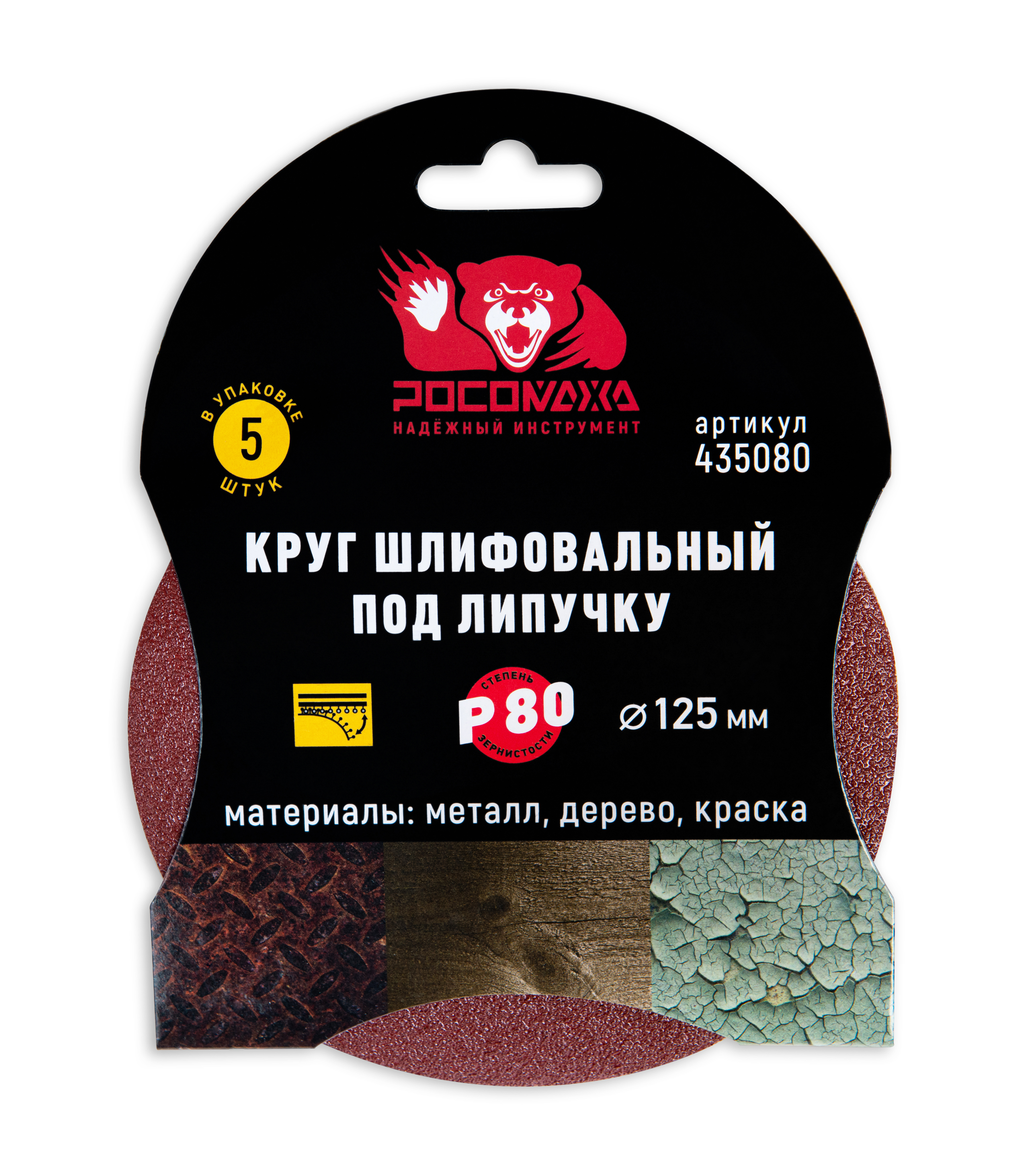 Круг шлифовальный под липучку 125 мм зерно 80 "РОСОМАХА" [5 шт]