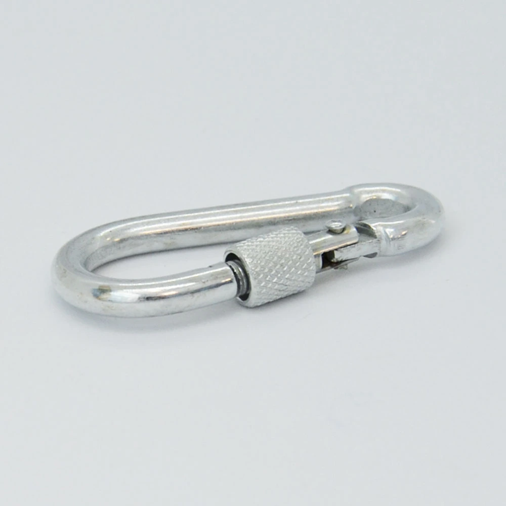 Карабин DIN 5299D - карабин с муфтой имеет форму овала, чуть зауженного с одной стороны. Карабин оснащен фиксатором, который для надежности закручивается на резьбу. Карабин DIN 5299D пожарный с фиксатором это высокопрочный соединитель для тросов. Карабин используют монтажники-высотники, пожарные, альпинисты, спасатели и многие другие профессионалы и любители. Производят из высокопрочной стальной проволоки и покрывают цинковым раствором.