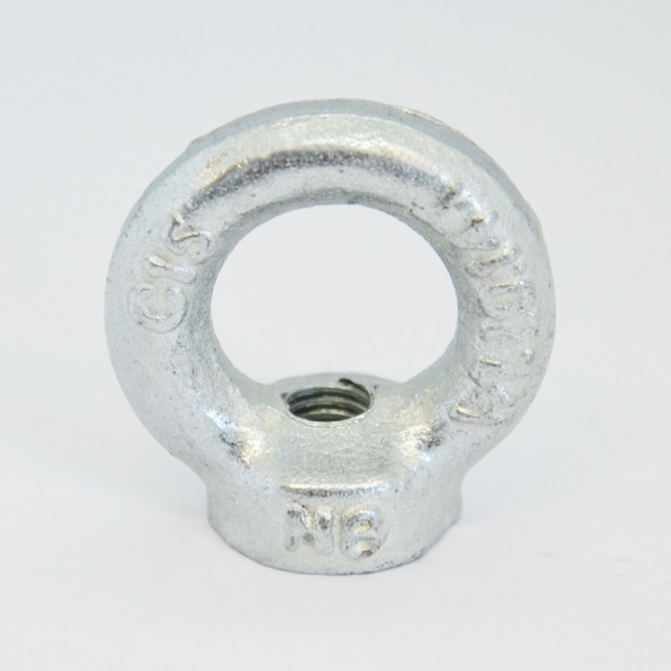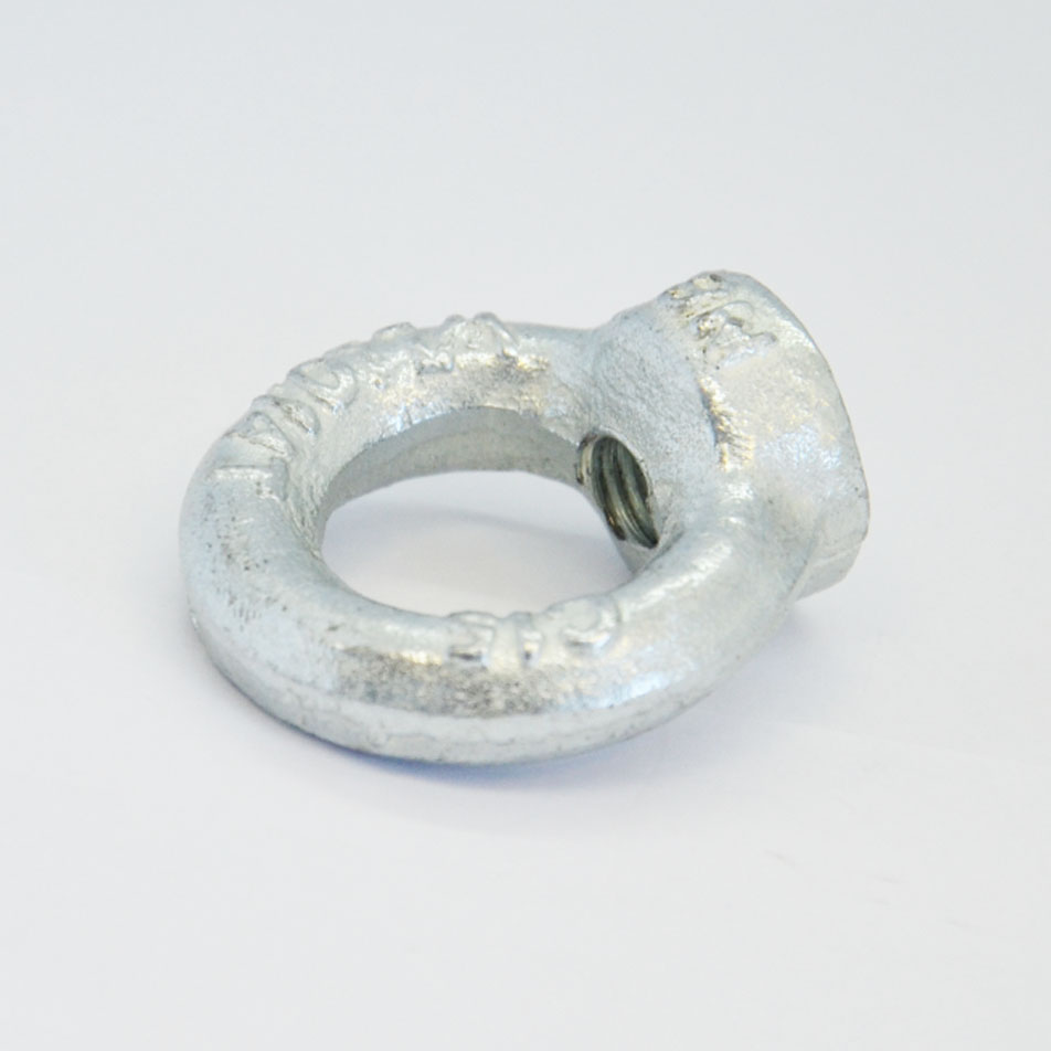 Рым-гайка DIN 582 - стальное кольцо, в основании которого имеется отверстие с нарезанной резьбой. Используется для крепления цепей и тросов и для создания различных растяжек. При такелажных работах рым-гайка может использоваться для подъема грузов. Размеры рым-гаек обозначаются в соответствии с размером метрической резьбы основания. Рым-гайки устанавливаются в закладные болты, либо, при сквозном монтаже, накручиваются на резьбовые шпильки. Изготавливается из углеродистой стали. После производства деталь проходит оцинковку.
