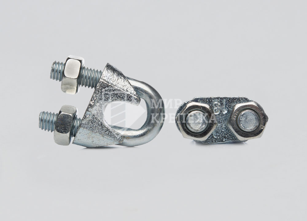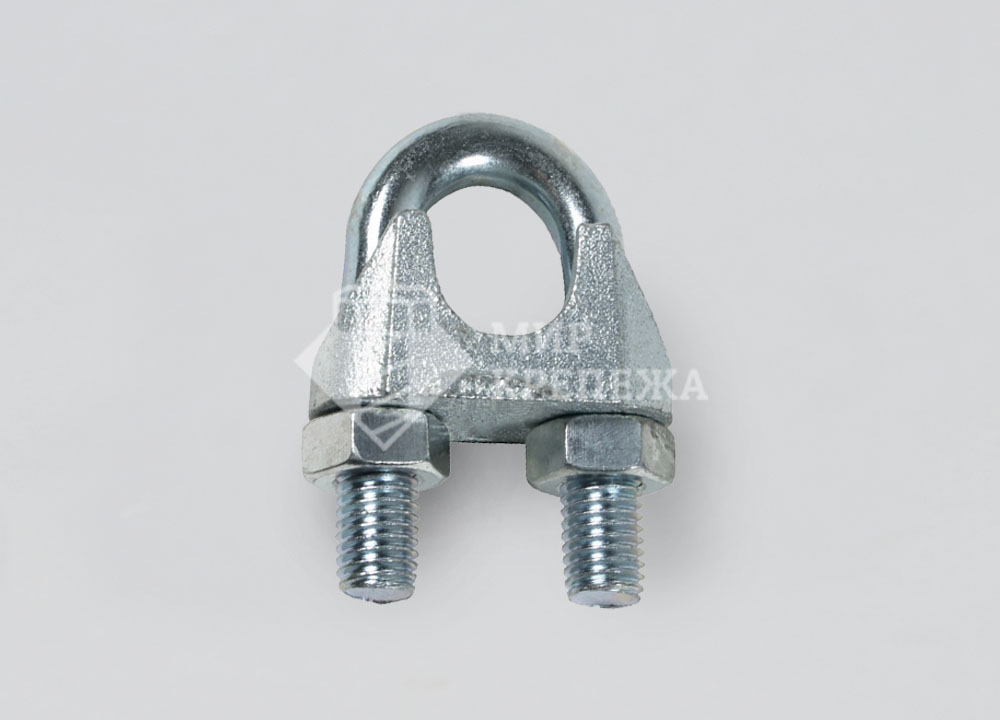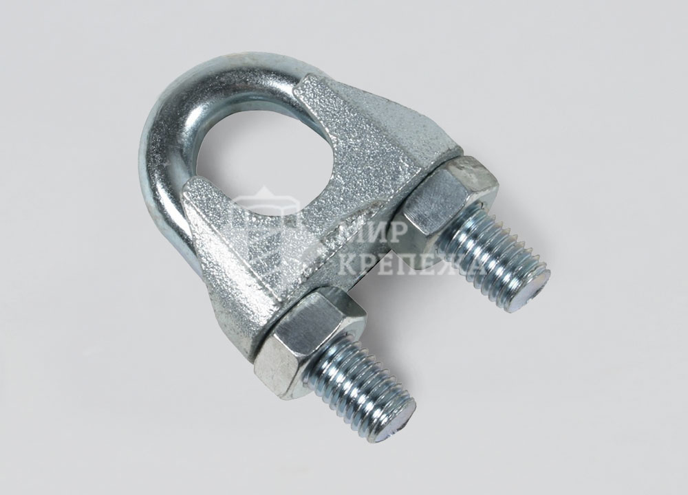 Зажим DIN 741 - зажим для троса выполнен в виде подковы, на обоих концах которой расположена метрическая резьба. Фиксация тросов и канатов ведется при помощи шестигранных гаек. Применяется при создании концевых петель, удлинения канатов. При помощью данного зажима крепятся крюки, скобы и прочие такелажные приспособления к канатам и тросам (при помощи петли). Основное применение деталь получила на такелажных работах и применяется для особо важных соединений, так как имеет высокий запас прочности.