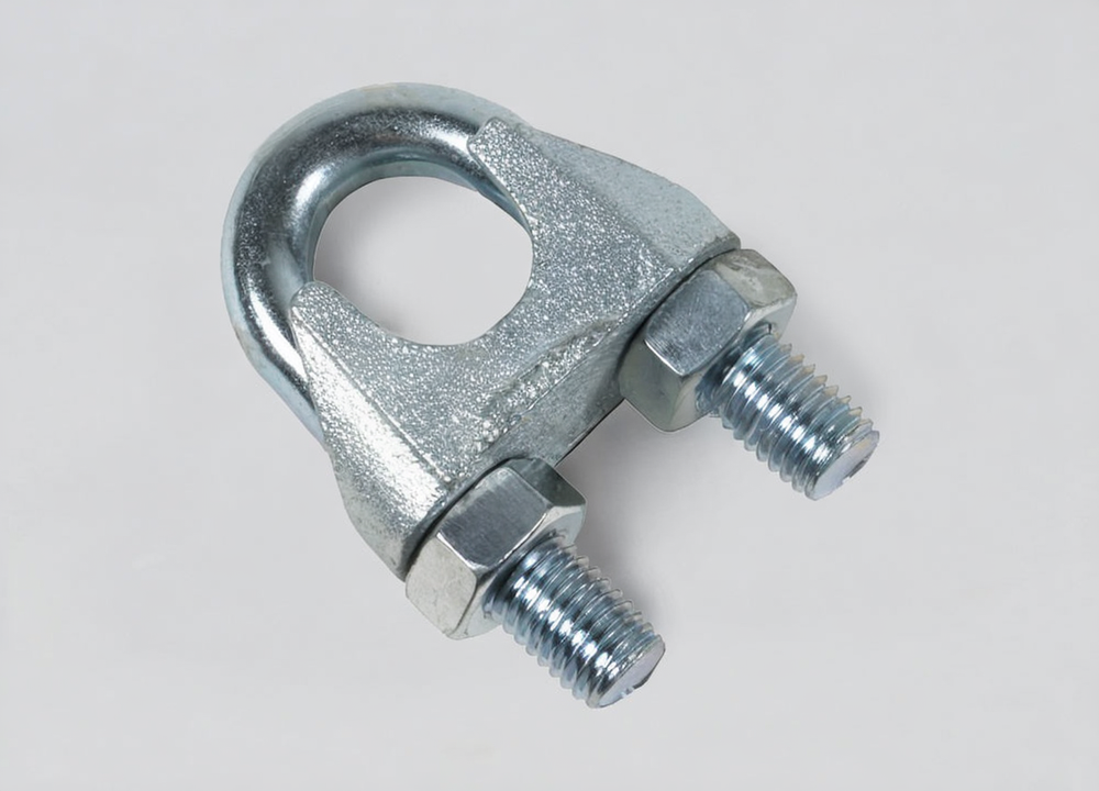 Зажим DIN 741 - зажим для троса выполнен в виде подковы, на обоих концах которой расположена метрическая резьба. Фиксация тросов и канатов ведется при помощи шестигранных гаек. Применяется при создании концевых петель, удлинения канатов. При помощью данного зажима крепятся крюки, скобы и прочие такелажные приспособления к канатам и тросам (при помощи петли). Основное применение деталь получила на такелажных работах и применяется для особо важных соединений, так как имеет высокий запас прочности.
